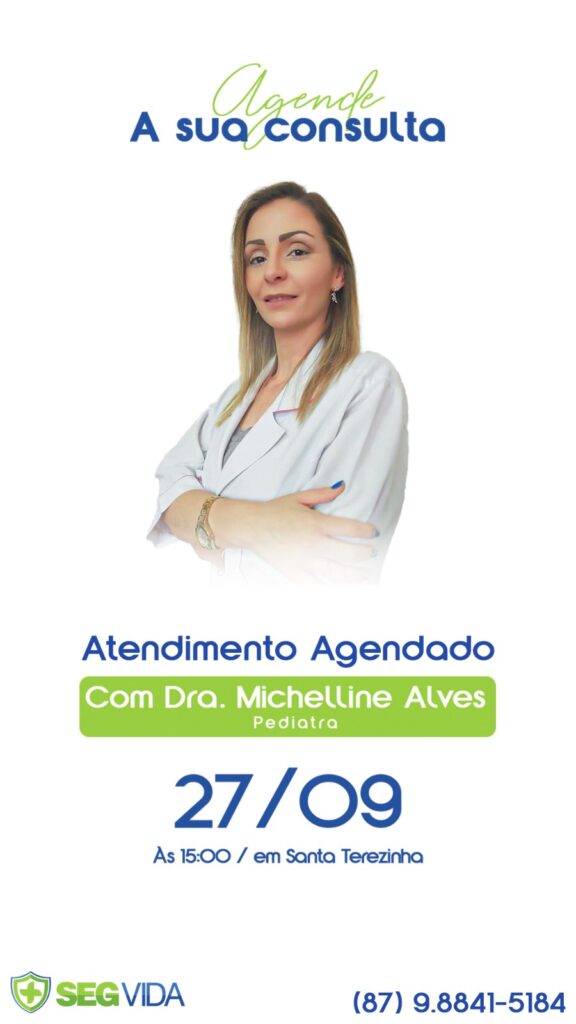 A SegVida em Santa Terezinha comunica aos seus usuários que o Pediatra Drª Michelline Alves estará atendendo por agendamento nesta sexta-feira, 27 de setembro a partir das 15:00 horas. Reserve agora mesmo seu atendimento entrando em contato pelo número (87) 98841-5184.