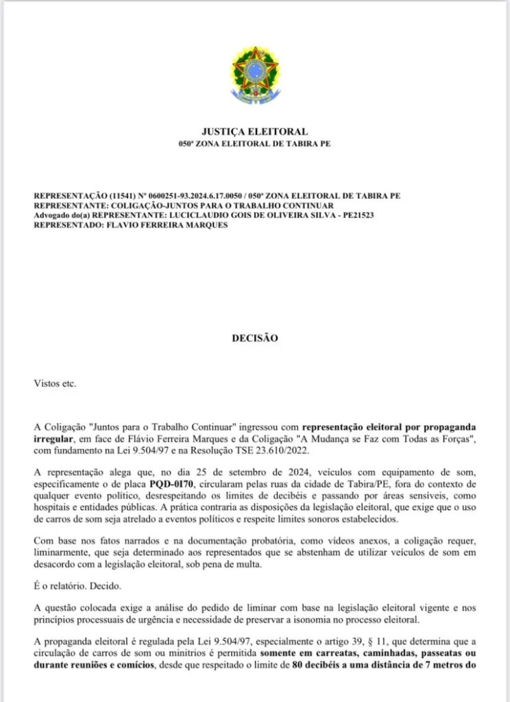 Segundo a decisão do juiz João Paulo dos Santos Lima, da 50ª Zona Eleitoral, um veículo identificado pela placa PQD-0170, estava propagando mensagens eleitorais de forma irregular, especialmente nas imediações de hospitais e instituições públicas, em desrespeito aos limites de volume sonoro previstos por lei. A decisão judicial determinou a imediata suspensão do uso desses equipamentos sonoros, que estavam sendo utilizados fora do contexto permitido.