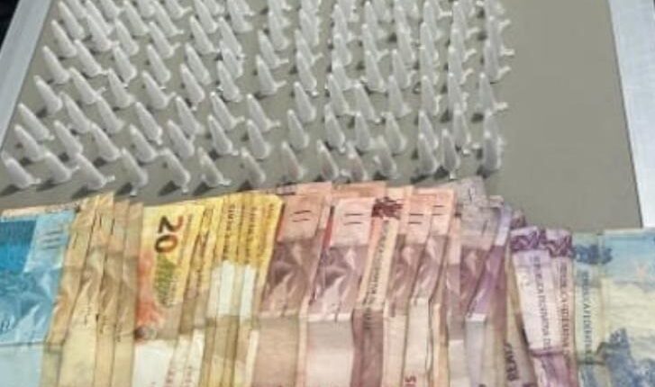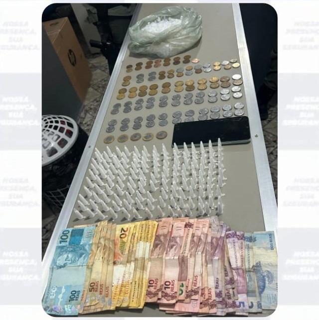 140 pinos de uma substância branca, análoga a cocaína, pesando aproximadamente 140g, bem como 402 pinos vazios. Após alguns metros, o imputado foi capturado, e com ele foi localizado a quantia de R$ 953,00 (novecentos e cinquenta e três reais) e no interior do seu veículo R$ 36,65 (trinta e seis reais e sessenta e cinco centavos), sendo que ele não informou a origem do dinheiro, além de um celular da marca REDMI 13C, o qual informou ser de sua propriedade, porém sua identificação não foi possível, devido se negar a desbloquear o aparelho.