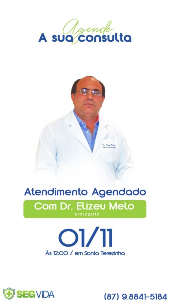 A SegVida em Santa Terezinha comunica aos seus usuários que nesta sexta-feira, 01 de novembro o Urologista Drº Elizeu Melo estará atendendo por agendamento antecipado a partir das 12:00 horas. Reserve hoje mesmo sua vaga entranto em contato pelo número (87) 98841-5184.