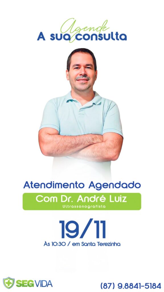 A SegVida em Santa Terezinha comunica aos seus usuários que o Ultrassonografista Drº André Luiz estará atendendo por agendamento nesta terça-feira, 19 de novembro a partir das 10:30 horas. Reserve agora mesmo seu atendimento entrando em contato pelo número (87) 98841-5184.