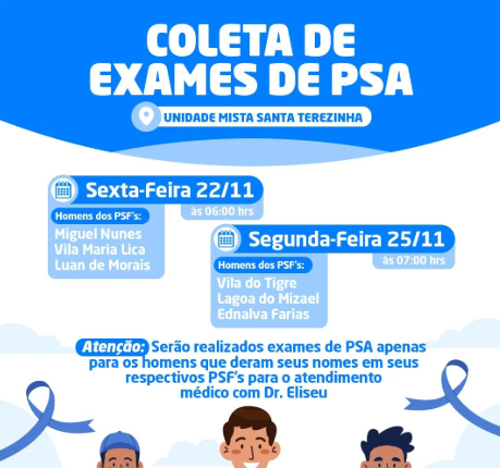 Nesta sexta-feira (22), a Prefeitura da cidade de Santa Terezinha, através da Secretaria Municipal de Saúde, vai realizar coleta de exames de PSA para os homens que registraram seus nomes aos seus respectivos PSF ‘s. Será na Unidade Mista Santa Terezinha.