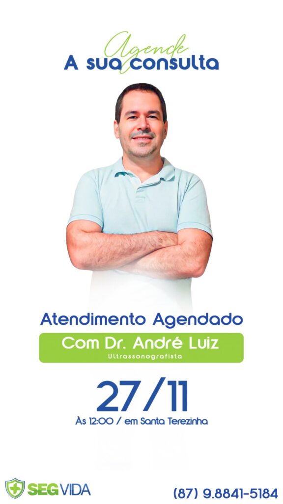 A SegVida em Santa Terezinha comunica aos seus usuários que o Ultrassonografista Drº André Luiz estará atendendo por agendamento nesta quarta-feira, 27 de novembro a partir das 12:00 horas. Reserve agora mesmo seu atendimento entrando em contato pelo número (87) 98841-5184.