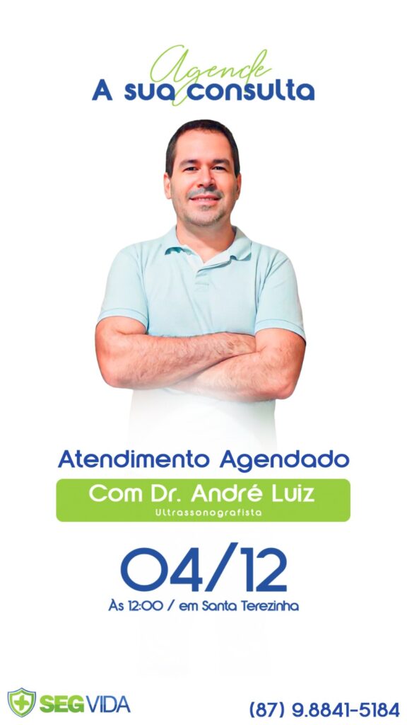 A SegVida em Santa Terezinha comunica aos seus usuários que o Ultrassonografista Drº André Luiz estará atendendo por agendamento nesta quarta-feira, 04 de dezembro a partir das 12:00 horas. Reserve agora mesmo seu atendimento entrando em contato pelo número (87) 98841-5184.