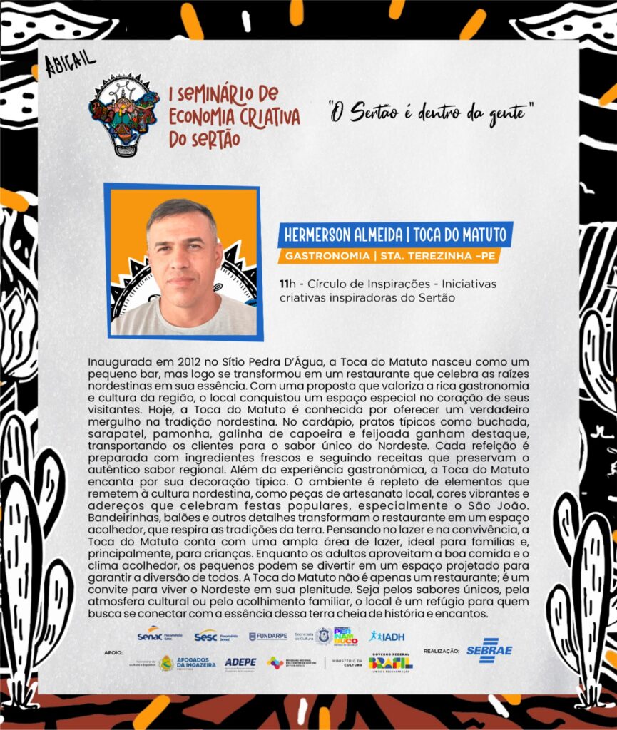 O representante Terezinhense, Neném da Toca do Matuto, participou da programação, a qual incluia palestras, painéis e oficinas, continuando dizendo que, “mostramos nossas comidas típicas e o ambiente acolhedor que reflete as tradições do sertão. Foi um momento especial para compartilhar a autenticidade da nossa cultura e contribuir para o fortalecimento da economia criativa na região. O evento buscou unir forças para fortalecer a cadeia produtiva artística e cultural”.