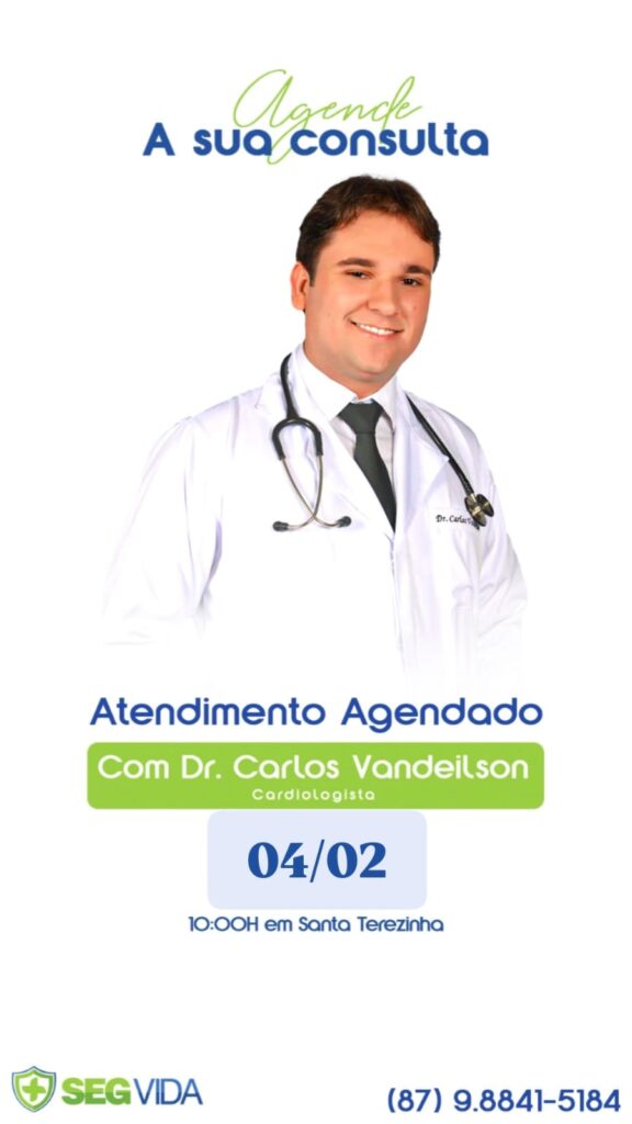 A SegVida em Santa Terezinha comunica aos seus usuários que o Cardiologista Drº Carlos Vandeilson estará atendendo por agendamento nesta terça-feira, 04 de fevereiro a partir das 10:00 horas da manhã. Reserve agora mesmo seu atendimento entrando em contato pelo número (87) 98841-5184.