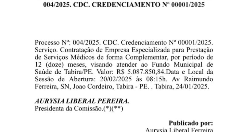 A oposição de Tabira está questionando o aviso de chamamento público processo 004/2025. O processo visa a contratação de empresa especializada para prestação de serviços médicos de forma complementar, por doze meses.