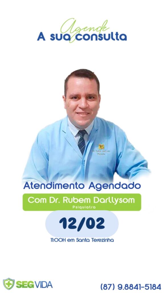 A SegVida em Santa Terezinha comunica aos seus usuários que o Psiquiatra Drº Rubem Darllysom estará atendendo por agendamento nesta quarta-feira, 12 de fevereiro a partir das 11:00 da manhã. Reserve agora mesmo seu atendimento entrando em contato pelo número (87) 98841-5184.