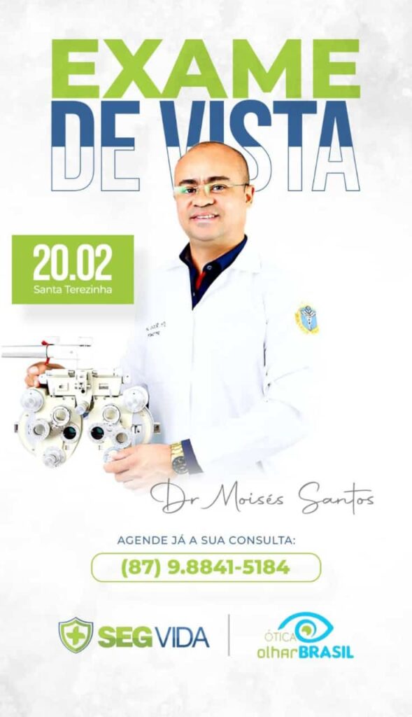 A SegVida em Santa Terezinha comunica aos seus usuários que o Optometrista Drº Moisés Santos estará atendendo por agendamento nesta quinta-feira, 20 de fevereiro a partir das 08:00 horas da manhã. Reserve agora mesmo seu atendimento entrando em contato pelo número (87) 98841-5184.