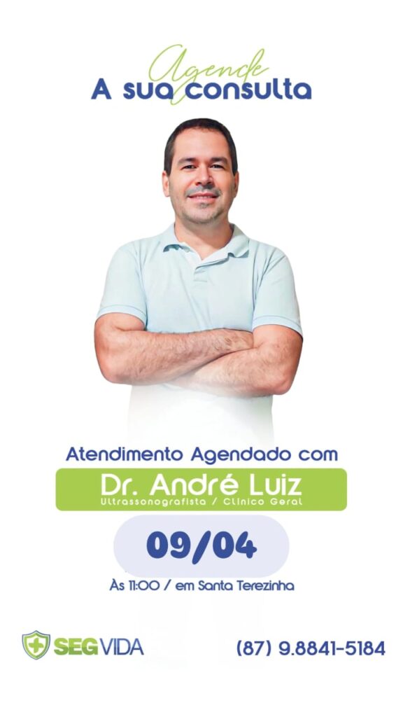 A SegVida em Santa Terezinha comunica aos seus usuários que o Ultrassonografista Drº André Luiz estará atendendo por agendamento nesta quarta-feira, 09 de abril a partir das 11:00 horas. Reserve agora mesmo seu atendimento entrando em contato pelo número (87) 98841-5184.