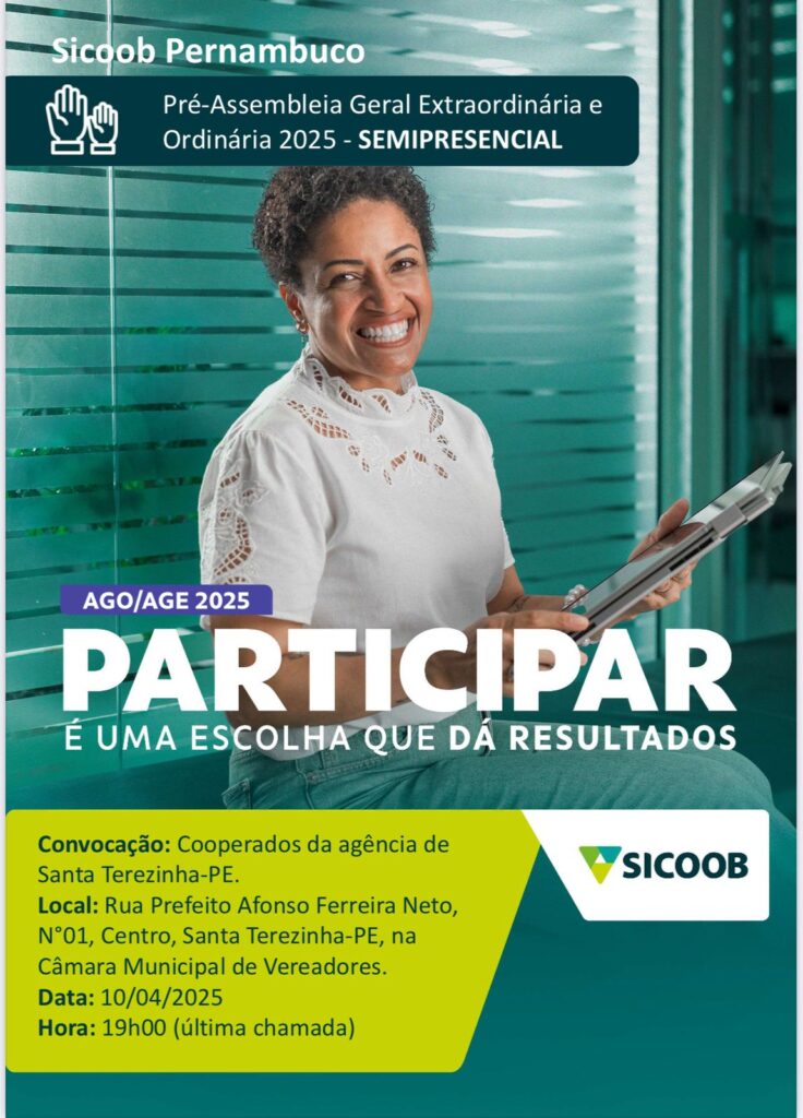 Na noite desta quinta-feira, 10 de abril o Sicoob de Santa Terezinha estará realizando uma Pré-Assembléia Geral Extraordinária na Câmara de Vereadores, na Rua Afonso Ferreira Neto, a partir das 19:00 horas. O desempenho do Sicoob para o ano de 2025 e as projeções para este ano serão apresentadas aos associados neste evento.