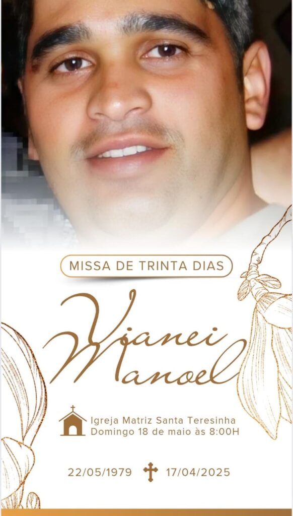 A família conta com a presença de amigos, parentes e conhecidos para orar (rezar) em intercessão de sua alma, que agora descansa no sono sagrado do Senhor. Para este domingo, 18 de maio de 2025 às 08:00 horas da manhã na Matriz de Santa Terezinha.