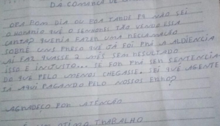 “DA COMARCA DE CARNAÍBA” – Olá bom dia ou boa tarde porque não sei o horário que os senhores ‘tão’ vendo essa carta. Queria fazer uma reclamação sobre uns presos que já foram para a audiencia ai, fazem quase dois meses sem resultado, isso é injusto!