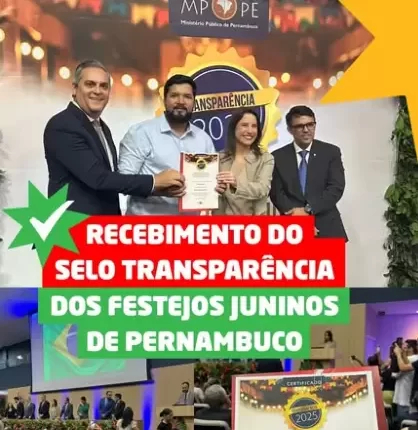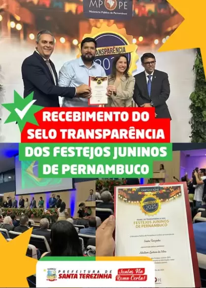 A Prefeitura Municipal de Santa Terezinha-PE, recebeu na última segunda-feira (21), o Selo de Transparência dos Festejos Juninos 2025, uma certificação concedida pelo MPPE, em parceria com o TCE-PE e a Amupe.
