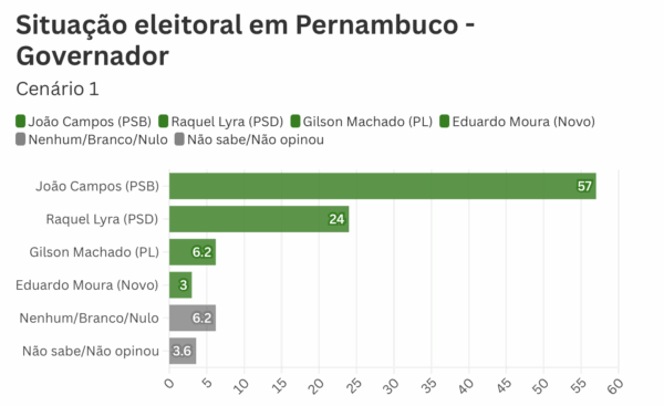 Na primeira simulação, Campos tem 57,0% das intenções de voto, contra 24,0%de Lyra. Na sequência, aparece o ex-ministro do Turismo Gilson Machado (PL), com 6,2%, seguido pelo vereador do Recife Eduardo Moura (Novo), que marca 3,0%. Votos em branco, nulo e nenhum somam 6,2%. Outros 3,6% não souberam ou não opinaram.