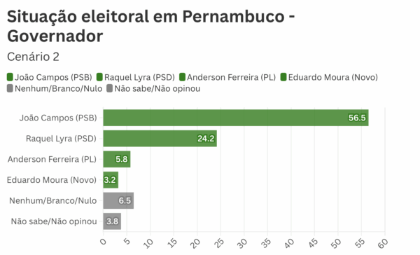 Já no segundo cenário, o prefeito do Recife surge com 56,5%, enquanto Lyra pontua 24,2%. O ex-prefeito de Jaboatão dos Guararapes e ex-deputado federal Anderson Ferreira tem 5,8%, e Moura, 3,2%. Votos em branco, nulo e nenhum totalizam 6,5%. Outros 3,8% não souberam ou não opinaram.