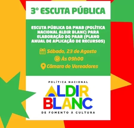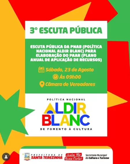 A Prefeitura de Santa Terezinha, através da Secretaria de Cultura e Turismo convida todos os fazedores de cultura para a 3ª Escuta Pública da PNAB (Política Nacional Aldir Blanc), com o objetivo de construir coletivamente o Plano Anual de Aplicação de Recursos (PAAR), que será realizada no próximo sábado (23), às 09 horas na  Câmara de Vereadores.