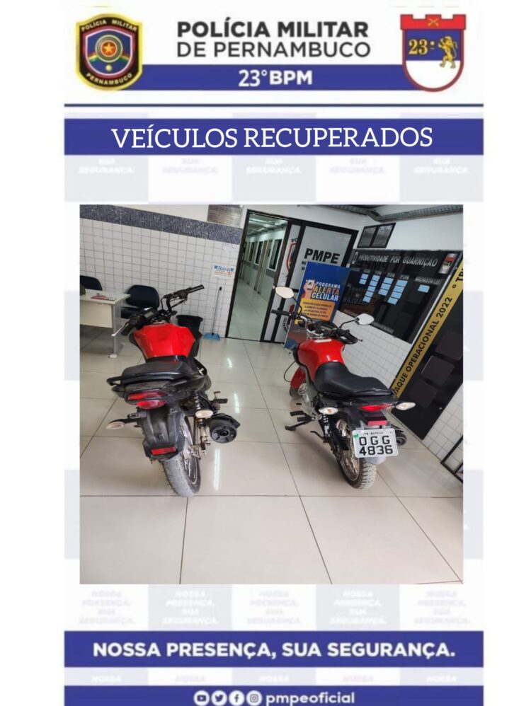 a manhã desta quarta-feira (27), o efetivo do 23º Batalhão da Polícia Militar de Pernambuco, em ação integrada de inteligência e policiamento ostensivo, recuperou duas motocicletas com restrição de roubo/furto e prendeu em flagrante um suspeito de receptação e adulteração de sinal identificador de veículo, na rua Antônio Medeiros Filho, no município de Afogados da Ingazeira.
