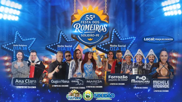 A Prefeitura de Solidão anunciou a programação da 55ª edição da Festa dos Romeiros, que ocorrerá de 16 a 18 de outubro de 2025, na Praça de Eventos.