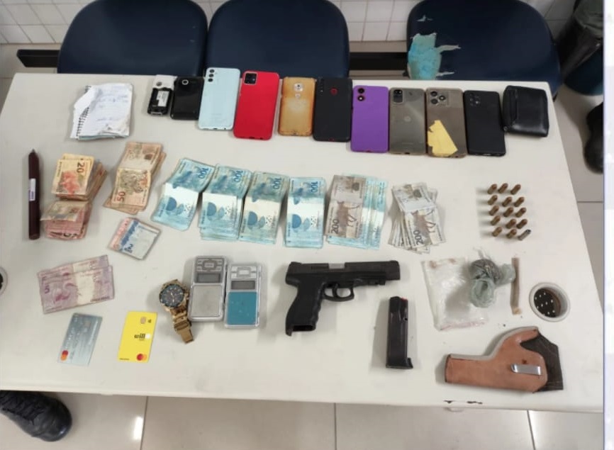 No momento da operação, o investigado foi flagrado consumindo entorpecentes junto aos imputados A. J. P. S., de 23 anos, F. F. R., de 20 anos, e C. E. L. S., de 18 anos. Todos possuem passagem por envolvimento com drogas.