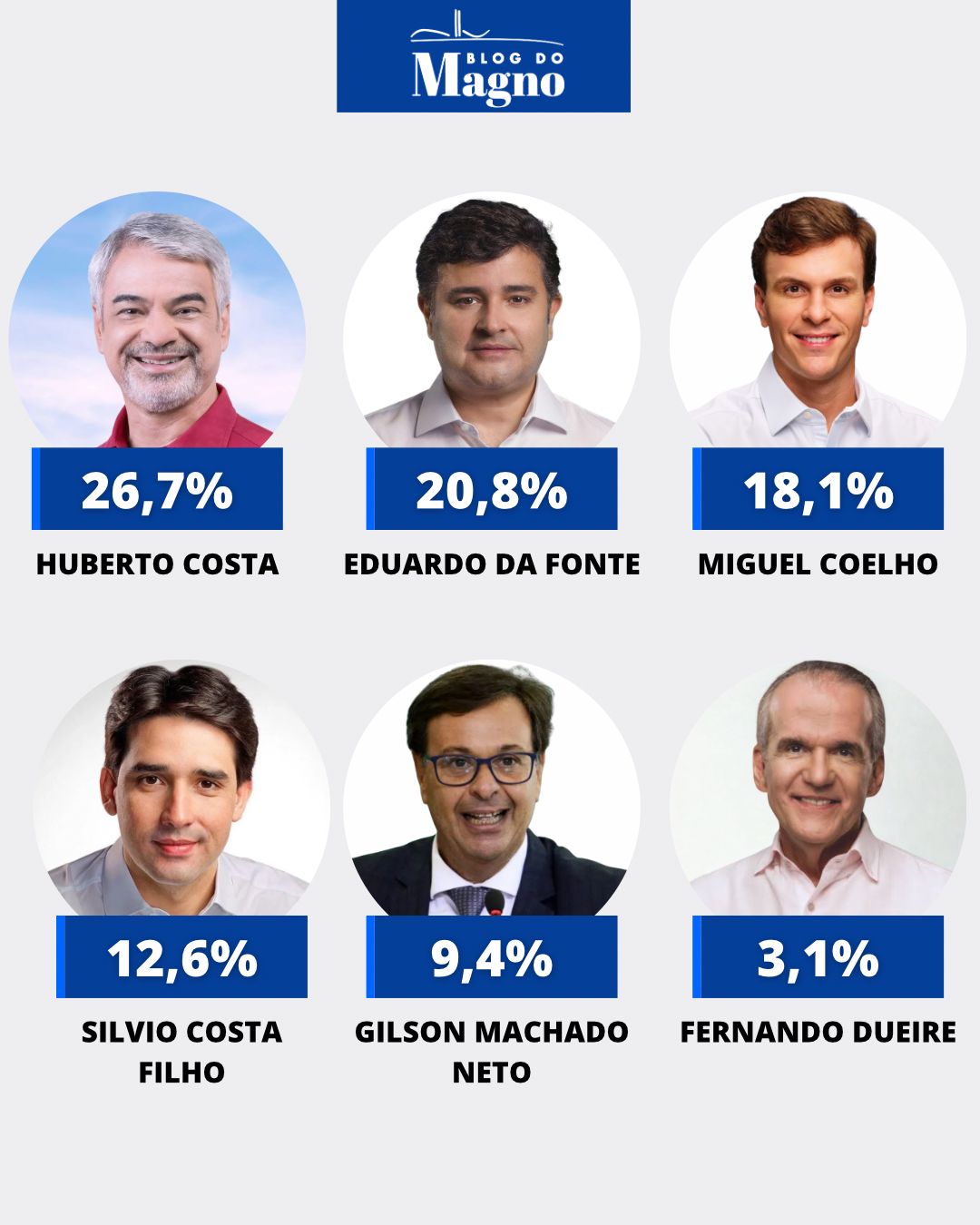 Já Miguel Coelho domina o São Francisco (46,6%), alcança 16,7% no Sertão, 9,9% no Agreste, 6,5% na Metropolitana e 3,7% na Zona da Mata. Sílvio Costa Filho aparece com 9,1% na Zona da Mata, 8,5% no Agreste, 4,4% na Metropolitana, 2,6% no Sertão e 0,8% no São Francisco.
