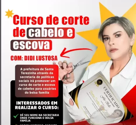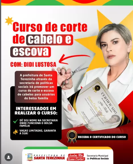 A Prefeitura de Santa Terezinha, através da Secretaria de Políticas Sociais, está oferecendo curso gratuito de corte e escova de cabelo com a profissional Didi Lustosa. O referido curso é voltado para usuários do Bolsa Família, o curso é uma oportunidade incrível de aprendizado e geração de renda! As inscrições: na Secretaria onde funciona o Bolsa Família, com vagas limitadas e no final certificado garantido ao final do curso.