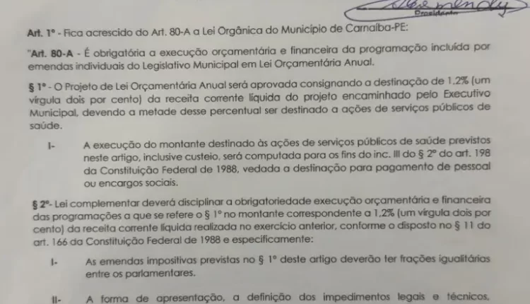 Vereadores de Carnaíba aprovaram emenda à Lei Orgânica 001/2025 criando na execução orçamentária e financeira do município emendas individuais do Legislativo Municipal em Lei Orçamentária Anual.