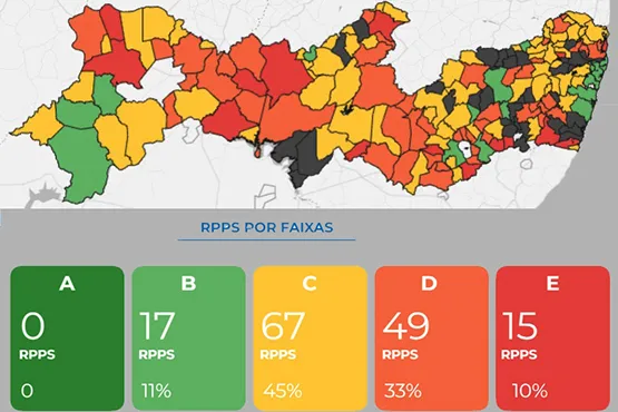 As notas atribuídas variam de A (excelência) a E, mas nenhum RPPS pernambucano alcançou a faixa máxima. Apenas 17 (11%) foram classificados com desempenho B.