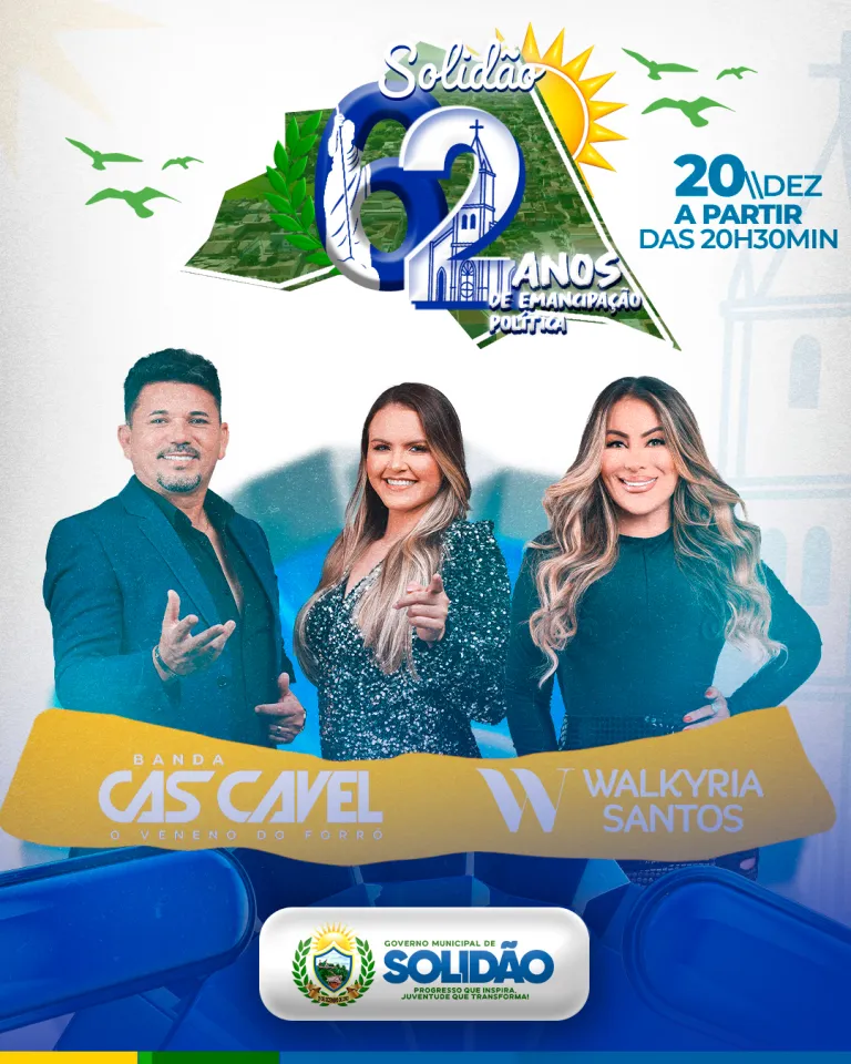 O município de Solidão já confirmou as atrações que irão marcar a celebração dos seus 62 anos de Emancipação Política, comemorados no dia 20 de dezembro, a partir das 20h30. Estão confirmados os shows da Banda Cascavel – O Veneno do Forró e da cantora Walkyria Santos, que prometem animar o público e celebrar, por meio da música, essa data tão importante para a história do município.