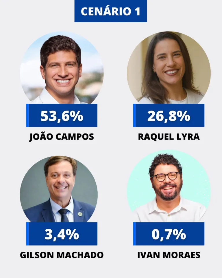 Em três cenários estimulados, João Campos mantém vantagem em relação à governadora Raquel Lyra (PSD), com diferença próxima de 25 pontos percentuais. No primeiro cenário, que inclui o ex-ministro Gilson Machado (PL) como representante do eleitorado conservador, João registra 53,6% das intenções de voto, enquanto Raquel aparece com 26,8%. Gilson Machado soma 3,4% e Ivan Moraes (PSOL), 0,7%. Brancos e nulos totalizam 7,6%, e 7,9% dos entrevistados se declararam indecisos.