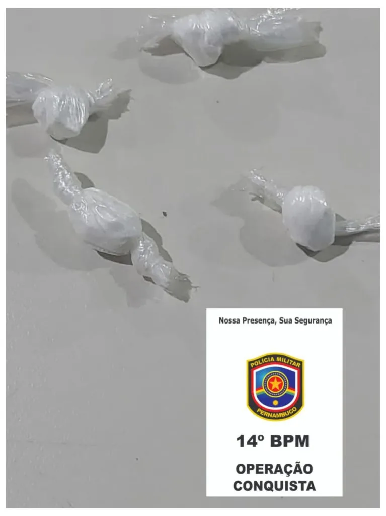 Durante a abordagem policial, foi encontrado no bolso do short do suspeito três porções de cocaína. Ao ser questionado sobre a droga, o homem declarou ter adquirido por R$ 150 de um indivíduo desconhecido.